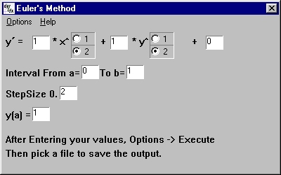 Performs Euler's Method on y`= a*x^n + b*y^m + c as well as range kutta and saves the calculations into a text file.